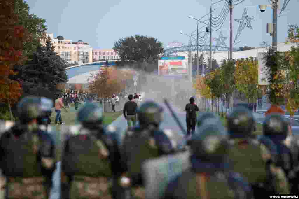 К вечеру, когда у стелы "Минск – город герой" собрались около пяти тысяч человек, силовики стали действовать крайне жестко: применялись водометы с оранжевой жидкостью вместо воды, дубинки, электрошокеры, слезоточивый газ. Есть раненые