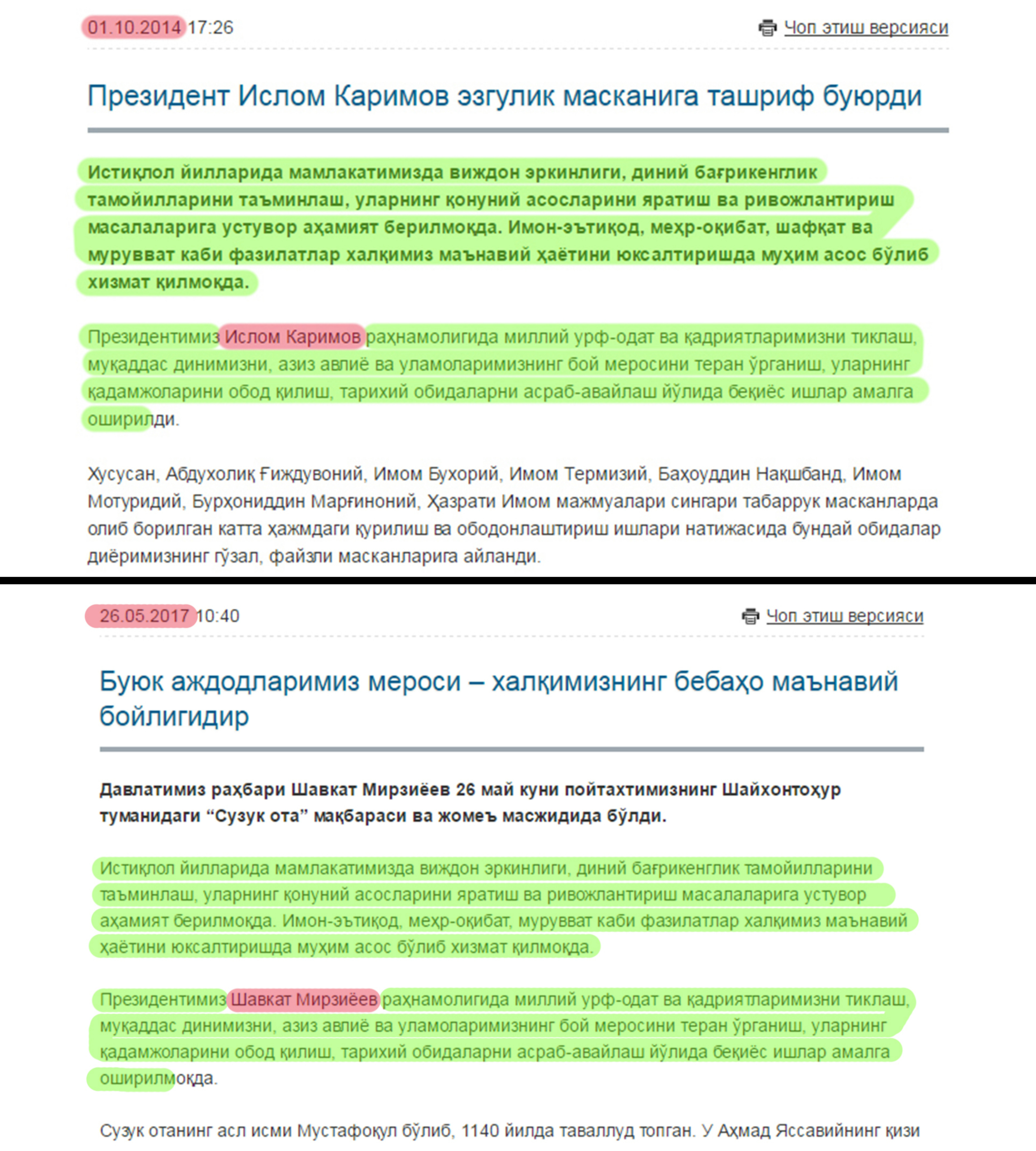 Между этими текстами – полтора года. Общее у них одно: авторы обоих материалов восхваляют мультикультурализм и толерантность в Узбекистане. В первом тексте это оценивается как результат "мудрого руководства Ислама Каримова", во втором – "успех Шавката Мирзиёева".